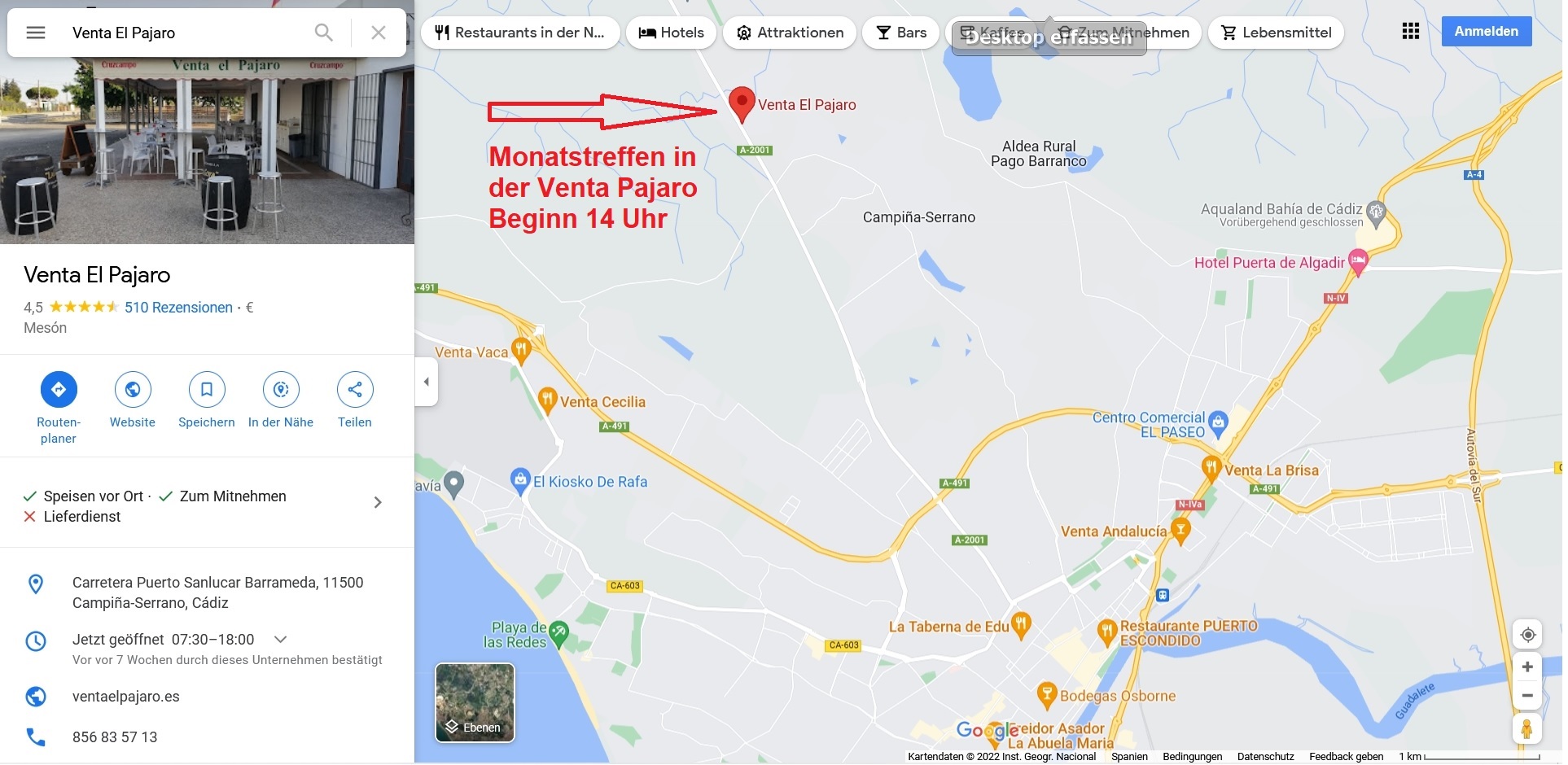 Im Anschluß findet ein Essen in der Venta „El Pajaro“ etwas außerhalb von El Puerto statt. Die Teilnehmer der Besichtigung werden gemeinsam im Konvoi von der Bodega zur Venta fahren!