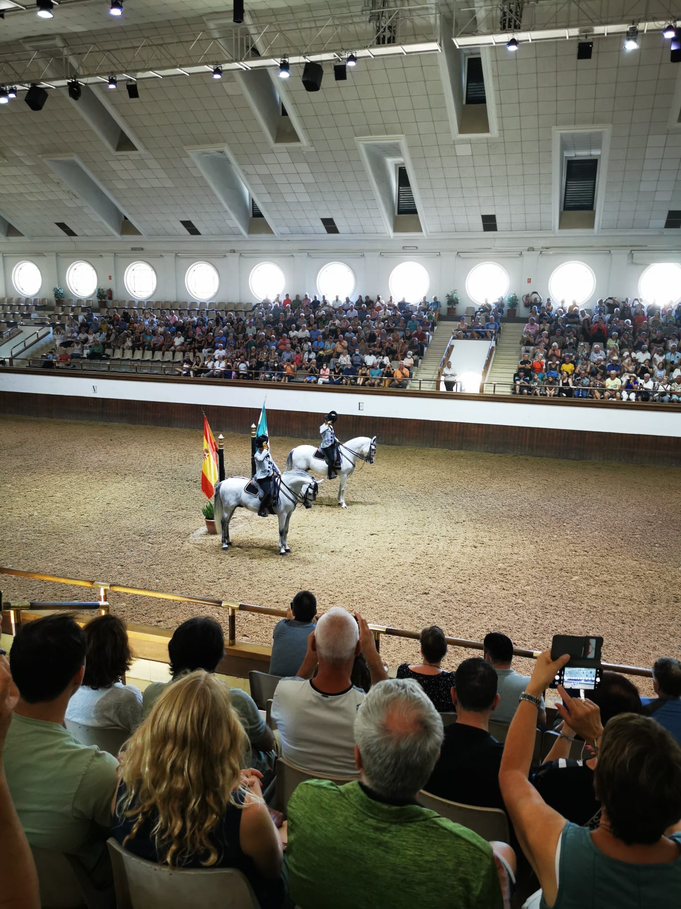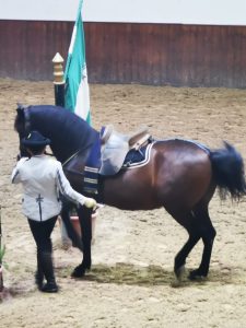 Ziel unseres Vereinsausflugs am 28. September 2023 war diesmal die Königlich-Andalusische Reitschule in Jerez. Claudia und Jolanda hatten dieses Event top organisiert und so trafen wir unsere Vereinsfreunde mit schon vorbereiteten Eintrittskarten um 11 Uhr vor der Reitschule. Zunächst gab es die Gelegenheit, das weitläufige Gelände mit Palast, Ausstellung und Reitplätzen zu besichtigen. Um 12 Uhr begann die Show unter dem Motto „Como bailan los caballos andaluces“ – Wie andalusische Pferde tanzen. Vom König gab es in dessen Loge leider nur ein großformatiges Ölportrait. Dafür wussten Einzelreiter, Gruppen, Gespanne und auch Dressurübungen der Haute École, begleitet von klassischer spanischer Musik zu überzeugen. Höhepunkt war sicherlich die Gruppe von acht edlen Pferden, auf denen die Reiter – und diesmal war sogar eine Reiterin dabei – in unterschiedlichen Choreographien eine perfekte Symbiose von Reiter und Pferd präsentierten.