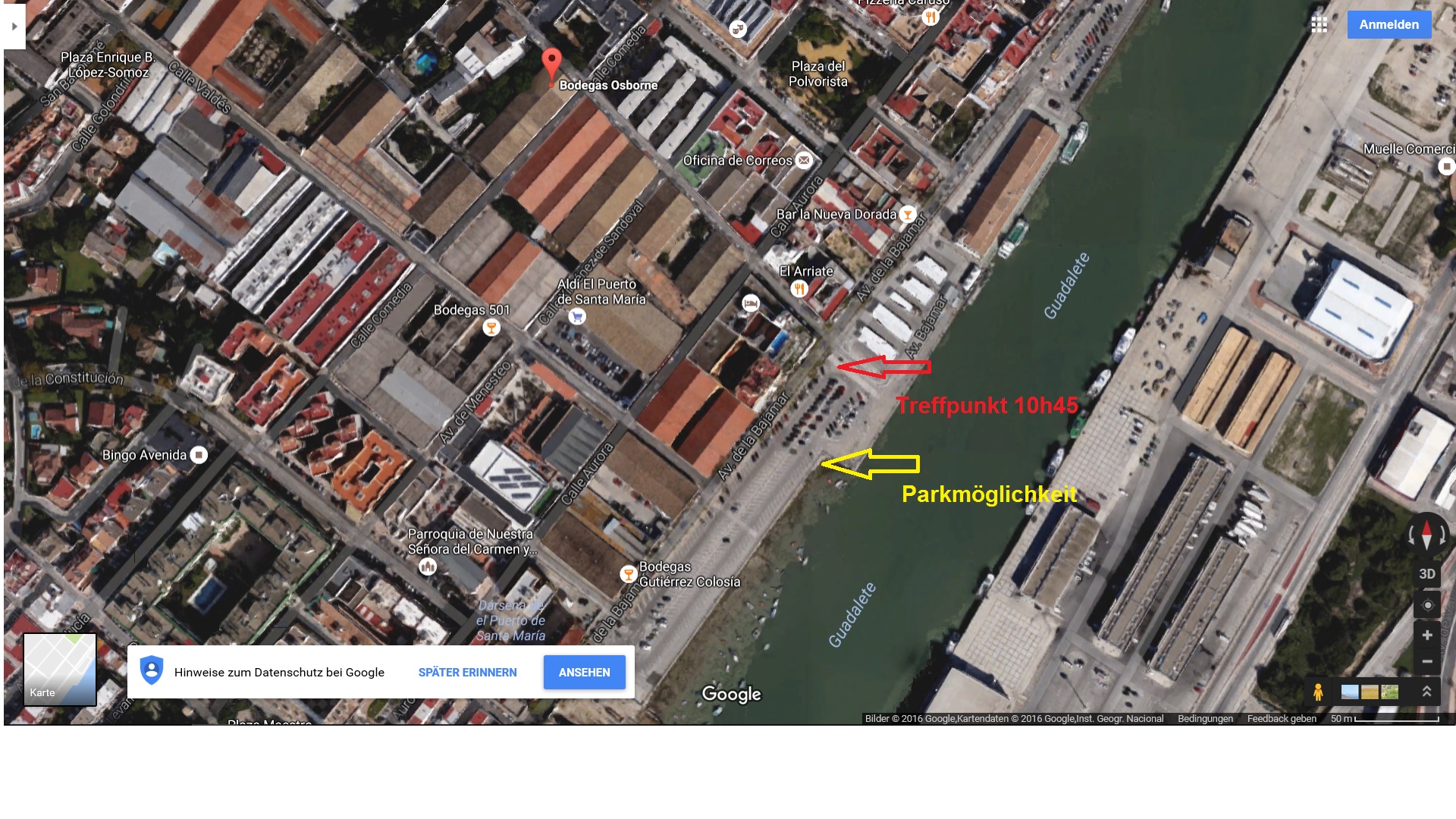 Wie bereits angekündigt soll dieses monatliche Treffen etwas besonderes werden. Wir werden um 11h00 die Bodega Osborne in El Puerto de Santa Maria besuchen. Die Besichtigung wird ca. 90 Minuten dauern. Danach werden wir je nach Lage einen gemeinsamen Spaziergang durch die Innenstadt von El Puerto machen um anschließend gemeinsam zum Restaurant zu fahren. Dort werden wir gegen 14h30 unser Menü genießen.